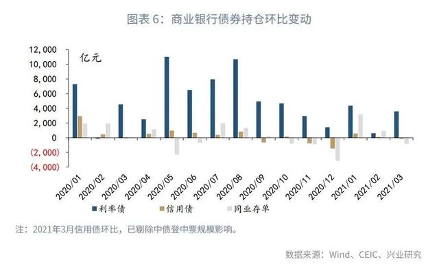 在3月利率债净融资较1月更大的情况下,商业银行利率债配置规模小于1月,表明商业银行对后市存在观望心态。