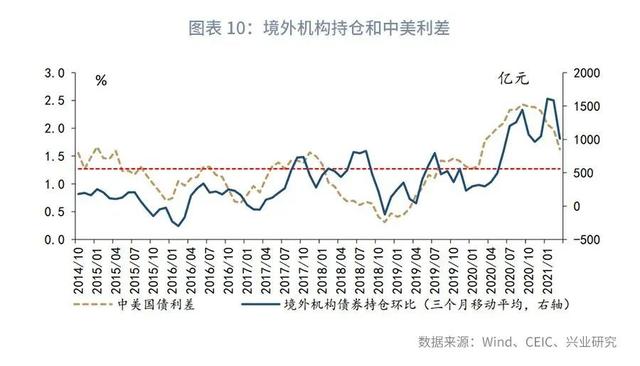 2021年3月,10年期美国国债收益率由1.44%上行30bp至1.74%,中美利差由年初的200bp左右压缩至150bp左右,较2020年第四季度240bp左右的历史高位明显回落,加之人民币汇率已结束单边升值行情,预计后续走势以震荡为主,中国债券的相对吸引力下降。