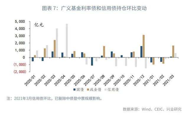 2021年3月,广义基金增持国债94亿元,增持政金债1627亿元;增持地方债1148亿元,根据历史数据的季节性规律,可能主要是银行理财增持地方债;剔除中债登数据口径影响后,广义基金小幅增持信用债581亿元,增持品种以超短融为主,其他信用债品种均明显减持。