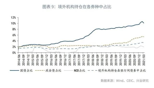 截至2021年3月,境外机构持有的债券在银行间债券市场的托管总量中占比3.4%,其中,境外机构持有的国债、政金债和NCD在各券种的存量规模中占比分别达到10.1%、5.4%和2.0%。