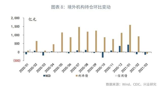 境外机构投资中国债市热情有所降温:2021年3月,境外机构环比合计减持90亿元,其中,减持国债165亿元,增持政金债76亿元,减持NCD 148亿元,这是自2020年4月以来,境外机构首次净减持银行间市场债券,自2019年3月以来,境外机构首次净减持中国国债。