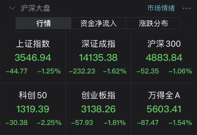 截至收盘,沪指跌1.25%,报3546.94点;深成指跌1.62%,报14135.38点;创业板指跌1.81%,报3138.26点。